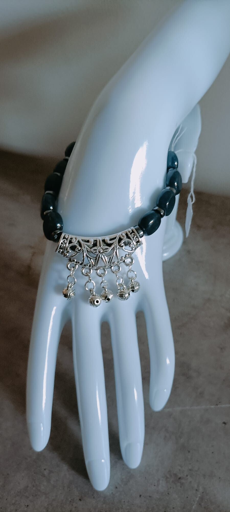 Le bracelet Dalia associe élégance et caractère grâce à ses perles noires lisses et son superbe pendentif argenté au style oriental. Ses petites breloques mobiles apportent une touche de féminité et de fluidité. Un bijou fantaisie chic, idéal pour sublimer vos tenues du quotidien.